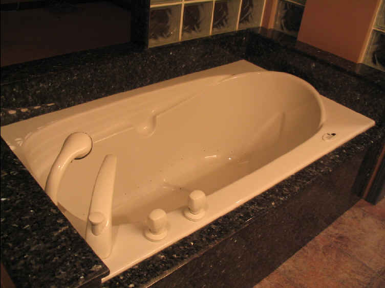 The master bedroom jacuzzi tub is surrounded by beautiful Pearl Blue granite with Absolute Black granite accents.